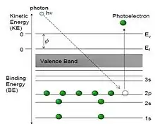 انرژی پرتو ایکس تابیده شده به ماده، صرف غلبه بر انرژی پیوند با رساندن آن به تراز فرمی BE، سپس غلبه بر تابع کار Φ و نهایتاً انرژی جنبشی لازم KE به سرعتی که الکترون کسب کردهاست، خواهد شد. بهطور ساده: hʋ = KE + BE + Φ