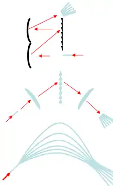 در طراحی طیف سنجی اصلی در اوایل قرن نوزدهم ، نور وارد شکاف شد و یک لنز موازی ساز نور را به یک پرتو نازک از پرتوهای موازی تبدیل کرد. نور پس از آن از طریق یک منشور (در طیف سنج های دستی، معمولا منشور AMICI ) عبور کرد، پرتو را به داخل طیف شکسنه می شد زیرا طول موج های مختلف به دلیل پراکندگی مقادیر مختلفی از شکست را به دنبال خواهد داشت. این تصویر سپس از طریق یک لوله با مقیاس که بر روی تصویر طیفی جابجایی شده است ، مشاهده شد و اندازه گیری مستقیم آن را امکان پذیر کرد.