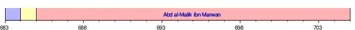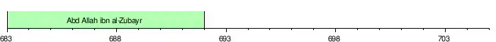 در میان سالهای ۶۸۰ تا ۶۹۲ میلادی و دوازده سال خلافت ابنزبیر، ۳ خلیفهٔ اموی بر تخت نشستند. نوار کوتاه بنفش و زرد نشان دهندهس مدت فرمانروایی معاویه دوم و مروان یکم است. (توجه شود که تکیه زدن بر تخت خلافت لزوماً در نخستین روز سال روی ندادهاست)