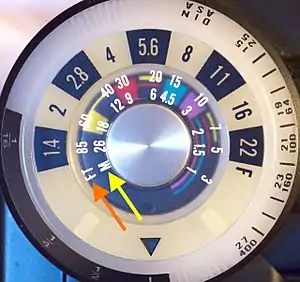 صحنه ای برای هر ترکیبی از توقف و فاصله نشان داده شده در شمارهگیری محاسبه قرار گرفتن در معرض این دستگاه فلش، به درستی روشن میشود، که هر یک برابر است با همان شماره راهنمای. شماره راهنما در اینجا (تنظیم برق کامل، ISO 100 و پوشش زاویه عادی) ۳۷ برای محاسبات انجام شده در متر (فلش زرد) و ۱۲۰ برای پا (نارنجی) است. به عنوان مثال، در مقیاس پا، f / 4 × 30 ft = ۱۲۰، f / 8 × 15 ft و f / 16 × ۵/۷ فوت را در متر، f / 1.4 × 1.4 m ۲۶ متر = ۳۷ و f / 22 × ۱٫۷ متر و هر ترکیب بین.