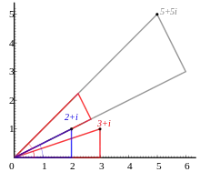 از آنجا که دو بخش حقیقی و موهومی 5 + 5i با هم برابرند آرگومان برابر ۴۵ درجه یا π/۴ رادیان است. از سوی دیگر مجموع زوایای رئوس منطبق بر مبدأ مثلثهای قرمز و آبی به ترتیب برابر تانژانت معکوس و است؛ بنابراین خواهیم داشت: