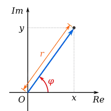 روش دیگر برای نمایش عدد مختلط استفاده از دستگاه مختصات قطبی است؛ در این روش به جای استفاده از x و y از فاصله نقطه P تا مبدأ و زاویه بردار OP با جهت مثبت محور حقیقی بهره میبریم. به این ترتیب قدر مطلق (یا اندازه عدد مختلط z = x + yi) مساوی ست با :