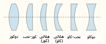 - عدسی هلالی (کوژ): آنچنان عدسی است که یک طرف آن کوژ و طرف دیگرش کاو باشد. این عدسی در عینکها استفاده میشود و تصویر از هر طرف آن به نوعی wide میباشد.