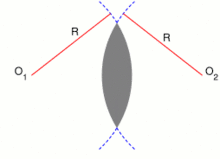 عدسی دو دایره با شعاع R, و به مرکزیت O1 و O2