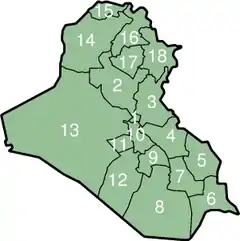 | اربیل | انبار | بابِل | بغداد | بصره | تأمیم | دهوک | دیاله | ذیقار | سلیمانیه | صلاحالدین | قادسیه | کربلا | مثنی | میسان | نجف | نینوا | واسط | |