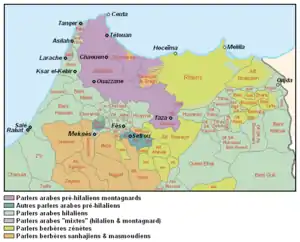 ![]() مناطق جبلی زبان به رنگ بنفش در نقشه زبانی مراکش | |