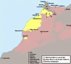 ![]() نقشه پراکندگی گویشوران مراکشی غربی به رنگ زرد | |