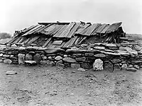 یک کلبه زیرزمینی سرخپوستان هوپا که سقف آن با تختههای چوبی پوشانده شده و اطراف آن با دیوارهای سنگی بزرگ احاطه شده است.