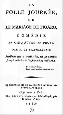 ![]() صفحه عنوان کتاب از نخستین چاپ ازدواج فیگارو | |