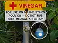 پستهای حاوی محلول سرکه در سواحل استرالیا به همراه تابلوی هشدار با عنوان؛ روی محل گزش بریزید و مالش ندهید. برای مصارف پزشکی و گزش های دریایی