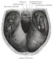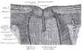 - قشر بینایی اولیه. این قسمت معادل ناحیه ۱۷ برودمن است که در لوب پس سری(Occipital lobe) مغز قرار دارد. قشر بینایی اولیه، قشر کالکارین[6] نیز نامیده میشود. توانایی دستگاه بینایی برای کشف و تشخیص سازمان فضایی منظره بینایی یعنی کشف شکل اشیاء، درخشندگی قسمتها ی انفرادی آنها، سایه روشن و غیره بستگی به عمل قشر بینایی اولیه دارد[7]. برداشتن این ناحیه باعث ازبین رفتن دید خودآگاه در فرد میشود.