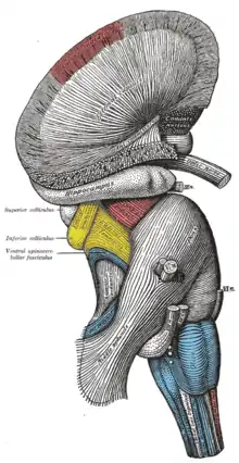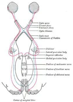 اکثر فیبرهای راه بینایی(حدود ۹۰%) جهت انتقال پیامها به قشر بینایی، ابتدا وارد هسته زانویی خارجی[5] تالاموس میگردند. بقیه فیبرها به بخشهای پایین تر مغز وارد میشوند.