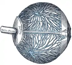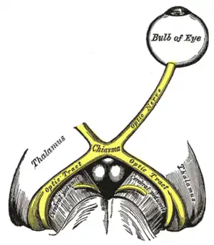 سلولهای استوانه و مخروط شبکیه از راه عصبهای دوقطبی به سلولهای گانگلیونی رسیده و پس از آن عصب بینایی شکل گرفته، وارد فضای کرانیکال شده و در تماس با سلا تورسیکا به طرف نواحی فوقانی مغز یا قسمتهای پایین تر مغز است. یک عصب بینایی حاوی حدود یک میلیون آکسون است. فیبرهای نیمه بینی از هر دو شبکیه، در ناحیه کیاسمای بینایی(Optic chiasma) تقاطع میکنند و به طرف مقابل میروند و به فیبرهای نیمه گیجگاهی(تمپورال) همان طرف میپیوندند و بدین ترتیب، راه بینایی(Optic tract) را در هر طرف ایجاد میکنند. نسبت رشتههای متقاطع به غیرمتقاطع، ۵۳ به ۴۷ بوده و تعداد سلولهای گانگلیونی نیمه بینی(نازال) شبکیه بیشتر است[4].