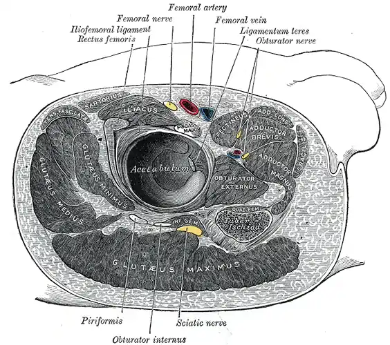 ![]() ساختار اطراف مفصل ران (عصب سدادی در سمت راست نشان داده شده است) | |