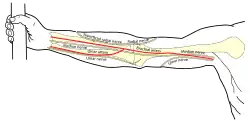 | عصبدهی | Anterior compartment of the forearm (with two exceptions), برجستگی بزرگ کف دست، Lumbricals, skin of the hand |