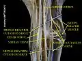 عصب پس از گذر از میان دو سر اتصالی ماهیچه درونگردان گرد، حفره آرنج را ترک و وارد ساعد میشود و از زیر قوس وتری دو مبدأ اتصالی ماهیچه خمکننده سطحی انگشتان دست (فلکسور دیژیتوروم سوپرفیشیالیس) (دو مبدأ اتصالی هومرو اولنار و رادیال) گذشته و در سطح عمقی آن قرار میگیرد.