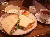 یک فنجان چای در فنجان چینی. (نگاره سمت راست) چای و ساندویچ در عصرانه بریتانیایی.(نگاره سمت چپ) | ||
