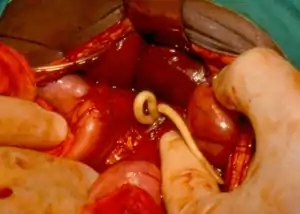 | کرمهای آسکاریس بالغ که از مجاری صفراوی یک بیمار در آفریقای جنوبی خارج میشوند | |