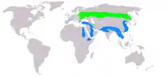 | گسترهٔ تولیدمثل (سبز روشن) و زمستانی (آبی) | |