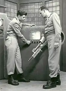 صحنه ای از برنامه تلویزیونی علمی تخیلی اولیه کاپیتان ویدئو و تکاوران ویدئویی اش که از سال ۱۹۴۹ تا ۱۹۵۵ پخش شد.