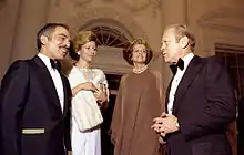ملکه علیا (چپ) به همراه شوهرش در شامل ضیافتی به همراه بتی فورد و جرالد فورد در ۳۰ مارس ۱۹۷۶.
