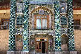 دو نیم ستون وسطی که درست در طرفین ورودی قرار گرفته بلندتر و بر بدنه هر یک ۱۲بار نام پیامبر اسلام محمد بن عبدالله به خط کوفی بنایی با طرحهای هندسی آراسته شدهاست. در حد و فاصل نیم ستونهای ورودی ۲ طاق نمای نسبتاً عمیق وجود دارد که با کاشیهای هفت رنگ نماسازی شدهاست. روی این طاق نماها نقوش اسلیمی و یک ترنج هندسی نقش شدهاست که در وسط آن نقش شیری وجود دارد که گاوی را از پای درآورده است. در تمام نقوش مذکور که بر کاشیهای هفت رنگ نقش شده و نیز نقوش بخشهای دیگر، غلبه با رنگ زرد است. در دو سوی ورودی این بنا در همین ضلع نقش ۲ سرباز مسلح قاجار دیده میشود که بهطور نمادین همچون ۲ نگهبان همیشه بیدار با چشمانی گشاده پیوسته ورودی و خروجی این ساختمان را کنترل میکنند.