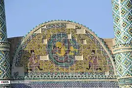 ورودی اصلی بنا در وسط ضلع شمالی حدود ۲۲۰سانتیمتر عرض دارد و سقف آن با قوس کلیل پوشیده شدهاست. در دو سوی این ورودی ۴ نیم ستون به قطر حدود ۱۰۵ سانتیمتر و ارتفاع بیش از ۱۰متر وجود دارد که تمام بدنه آنها با کاشیهای فیروزهای، لاجوردی و نیز کاشیهای سیاه، سفید و زرد پوشیده شدهاست.