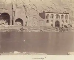 چشمانداز محل عمارت در سمت راست طاقهای ساسانی و روی پل در دوره محمد شاه قاجار اثر اوژن فلاندن