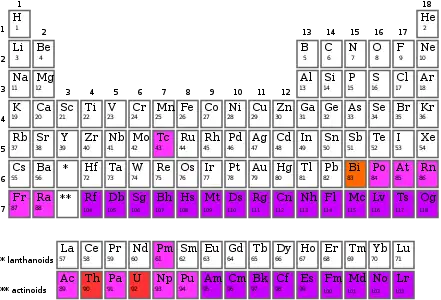 (بنفش) عناصر پرتوزا طبیعی نادر که معمولاً به صورت مصنوعی تولید می شود (نارنجی) عناصر رادیواکتیو طبیعی
