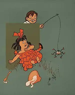 | اگر چه بسیاری از عنکبوتیان بیضرر (خطر) هستند با این همه، فرد مبتلا به عنکبوتهراسی ممکن است همچنان با مشاهده آنها وحشت یا احساس ناراحتی کند. گاهی اوقات، حتی مشاهدهٔ یک شی شبیه بع عنکبوت هم میتواند باعث ایجاد وحشت در فرد شود. تصویر کارتونی فوق، بخشی از قافیه ترانهٔ بچههای مهدکودک به نام میس مافِت کوچولو است در حالی که کارکتر کوچک درون تصویر، از مشاهده یک عنکبوت ترسیدهاست. | |