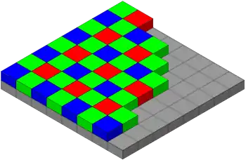 در عکاسی دیجیتال، سنسور (حسگر) وظیفهٔ ثبت تصویر را بر عهده دارد و هیچکدام از سنسورها به صورت مستقیم قادر به شناسایی رنگها نیستند و فقط میتوانند شدت روشنایی نور را ثبت کنند. هر سنسور از میلیونها سنسور ریز حساس به نور تشکیل شده و هرکدام از این حسگرهای ریز غالباً یک پیکسل از عکس نهایی را ثبت میکند. سازندگان این سنسورها با قرار دادن فیلترهای سرخ، سبز و آبی (رنگهای اولیه) روی تک تک آنها با استفاده از الگوهایی مانند الگوی بایر[پانویس 18] میتوانند به پردازشگرهای دوربین قابلیت آن را بدهند که با کمک الگوریتمهای درونیابی (اینترپولیشن) و مقایسه ارقام ثبت شده توسط ریز سنسورهای مجاور، رنگ واقعی هر پیکسل را حدس بزنند. دوربینهایی که قابلیت ذخیرهٔ عکس را به صورت خام[پانویس 19] دارا هستند، اجازه میدهند که این بخش نهایی شناسایی رنگها روی رایانه شخصی انجام شود و این به کاربران اجازه میدهد که آزادی بیشتری در ویرایش عکس نهایی داشته باشند.[53]