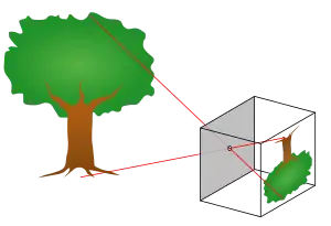 اتاق تاریک منجر به تکامل عکاسی و پیدایش دوربین عکاسی شد. اتاق تاریک عبارت از اتاقی بدون پنجره است که به جز روزنهای که بر یکی از دیوارهای اتاق تعبیه شده، هیچ نوری به آن وارد نمیشود. تصاویر یا چشماندازهای روبهروی روزنه به صورت وارونه بر دیوار روبرویش بازتاب مییابد که قابل دیدن است. بعضی از نگارگران از تصاویر بازتاب یافته به عنوان الگوی نقاشی استفاده میکردند. بعدها این اتاق تاریک در ابعاد کوچکتر تبدیل شد به دوربین عکاسی شد یعنی در برابر روزنهای که وجود داشت مادهٔ حساس به نور قرار میدادند تا تصاویر بازتابش یافته، ثبت و ضبط شوند.[19]
