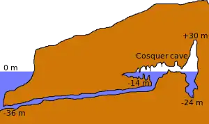 ![]() برش عرضی تونل ورودی به غار کاسکو و سطح کنونی دریا | |