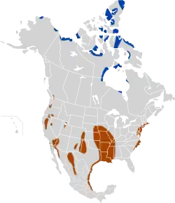 | آبی: نواحی تولیدمثل، قهوهای کمرنگ: نواحی زندگی در زمستان. | |