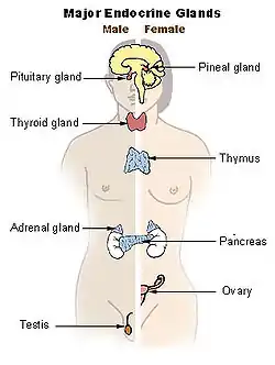 ![]() Endocrine system. (Parathyroid gland not pictured, but are present on surface of thyroid gland, as shown below.) | |