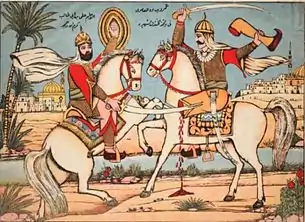 ![]() نبرد تن به تن مابین علی بن ابی طالب (چپ) و عمرو بن عبدود (راست) در غزوه خندق | |||||||
