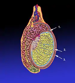 ![]() Diagram of a cross-section of a testicle. 1. Cavity of tunica vaginalis, 2. Visceral lamina, 3. Parietal lamina. | |