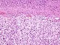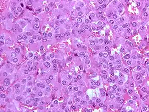 | بزرگنمایی بالا عکاسی ریزنگاری یک فئوکروموسیتوما, نشان دهنده ترتیب تو در تو سلولهای (Zellballen) و stippled chromatin. H&E stain. | |
