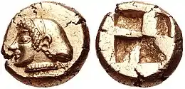 سکه ضرب شده در ساتراپی فریگیه هلسپونت در زمان فارناباز یکم، سیزیک، میسیا. حدود ۵۰۰–۴۵۰ پیش از میلاد. این نوع سکههای الکتروماتیک به عنوان سکه طلا در نظر گرفته میشدند و در کنار داریک هخامنشی رقابت میکردند.[1]