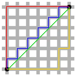 به طول کوتاهترین خط بین دو نقطهی و فاصلهٔ اقلیدسی (با نماد [1]) گفته میشود.