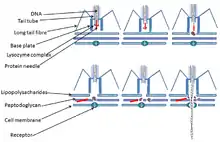 باکتریوفاژها ویروسهایی هستند که باکتریها را آلوده میکنند. انواع بسیار مختلفی از باکتریوفاژها وجود دارند که به گونههای خاصی از باکتریها تمایل دارند و فقط میزبان باکتریایی خاصی را آلوده میکنند. فاژها مانند سایر ویروسها دارای یک اسید نوکلئیک درونی (DNA یا RNA) هستند که این ژنوم توسط یک پوشش پروتئینی حفاظتی در خارج احاطه شدهاست.[1]