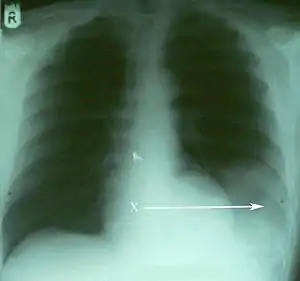 | اشعهایکس، طحال را در پایین و سمت چپ از حفره قفسه سینه نشان دادهاست.[1] | |