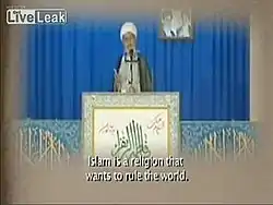 در بخش دیگری از فیلم نیز تصویر و صحبتهای علی مشکینی، رهبر پیشین مجلس خبرگان رهبری، آورده شده که میگوید: «دین اسلام دینی است که دنیا را میخواهد اداره کند و اداره کرده و بالاخره اداره خواهدکرد.»