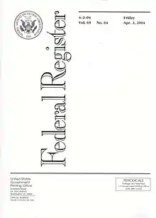 - مشارکتکنندگان ویکیپدیا. «Federal Register». در دانشنامهٔ ویکیپدیای انگلیسی، بازبینیشده در ۲۳ فوریه ۲۰۲۰.