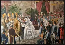 در ۱۸۵۳ الیزابت به همراه مادر و خواهرش هِلِنه[persian-alpha 17] برای دیدار با فرانتس یوزف به باد ایشل سفر کردند. هلنه دختر خالهٔ فرانتس یوزف یکی از کاندیدهای ازدواج بود. با این وجود فرانتس یوزف دل به خواهر کوچکتر، سیسی نامی که خانواده و فرانتس یوزف به کار میبردند، بستهبود و با او که در آن زمان پانزده سال داشت نامزد کرد. آنها در هفت عصر روز ۲۴ آوریل ۱۸۴۵ در وین ازدواج کردند. زندگی زناشویی آنها در طولانی مدت خوشایند نبود، سیسی به دلیل اختلاف با خانوادهٔ سلطنتی مدت زمان زیادی را دور از وین و مادر شوهرش سوفی میگذراند.[35]