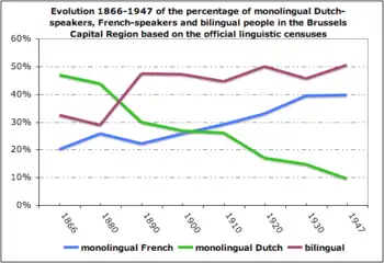 اگرچه بیشینه جمعیت تا نیمه دوم سده بیستم دوزبانه بودند،[13][6] گویش بومی هلندی به نام برابانتی[26] اغلب دیگر از نسلی به نسل دیگر منتقل نمیشد،[27] که این رخداد منجر به افزایش فرانسویزبانان یکزبانه از سال ۱۹۱۰ به بعد شد.[21][28] این تغییر زبان پس از دهه ۱۹۶۰ ضعیف شد،[13][29] زیرا مرز زبانی ثابت، هلندی به عنوان یک زبان رسمی تأیید[30] و مرکز ثقل اقتصادی نیز به سمت شمال و فلاندر منتقل شده بود.[16][24]