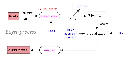 بوکسیت مهمترین سنگ معدن آلومینیوم است که شامل ۳۰ تا ۵۴ در صد آلومینا و مابقی شامل سیلیس، اکسیدهای آهن و تیتانیوم دی اکسید است. به منظور خالص سازی آلومینا در این روش از محلول گرمی(۱۷۵ °C) از سدیم هیدروکسید برای شستن سنگ بوکسیت استفاده میشود. این عمل آلومینا را به آلومینیوم هیدروکسید تبدیل میکند که در سدیم هیدروکسید محلول است(بر اساس معادله شیمیایی زیر):
