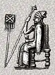 ![]() درفش کاویانی و شاه پارسه بگداد یکم حین نشستن بر تخت پادشاهی، عصای فرمانروایی را به دست راست و جام نوشیدنی را به دست چپ دارد. | |