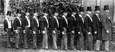 شاه تایلند (سمت راستترین) با تعدادی از ۳۳ فرزند پسرش در دانشگاه آیتون، ۱۸۹۷.