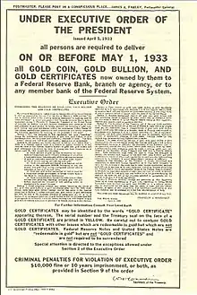 دلیل اعلام شده برای فرمان این بود که «احتکار» طلا، اوقات سختی را موجب شده، رشد اقتصادی را کند و رکود را بدتر کرده بود.[1] نیویورک تایمز یک روز بعد با تیتر «احتکار طلا،» «فرمان اجرایی دیروز رئیس جمهور هشدارهای قبلی او را تقویت و تشریح میکند» منتشر شد. این فرمان احتکار سکه طلا یا نقره را با مجازات ۱۰ هزار دلاری و تا پنج یا ده سال زندان مواجه کرد.[2]